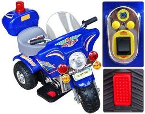 This awesome battery powered ride on electric motorcycle is great for kids. Features include, a rechargeable 6 volt battery, 3 wheels with treads, working lights, & a 6 Volt charger. Check out the awesome police style siren lights. Start cruising your house or block in style with this awesome battery powered ride on toy. Plus, it has plenty of power to get up concrete aprons and can ride on sidewalks too.